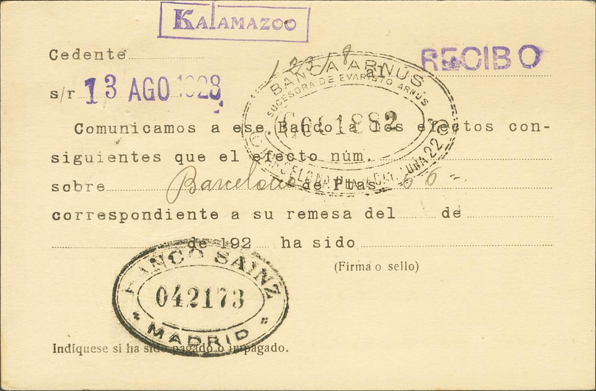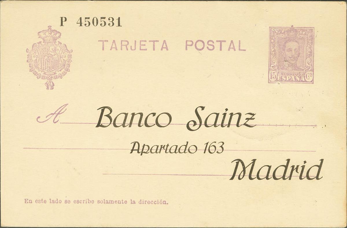 EP57naip. 1928. 15 cts purple on Postal Stationery Card with private overprint BANCO SAINZ / BOX 163 / MADRID from BARCELONA to MADRID. MAGNIFICENT AND UNUSUAL. (Láiz 2006: 120 Euros)