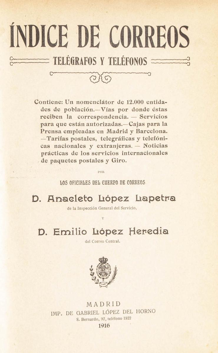 1917. POST, TELEGRAPH AND TELEPHONE INDEX. Anacleto López Lapetra and Emilio López Heredia. Madrid, 1916. (copy slightly worn)