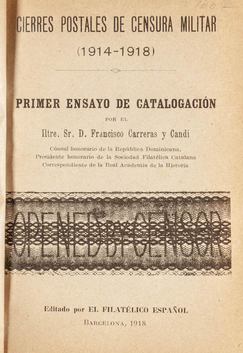 English 1918. MILITARY CENSORSHIP POST CLOSURES (1914-18). Francisco Carreras and Candi. Edits The Spanish Philatelic. Barcelona, 1918. (bound)