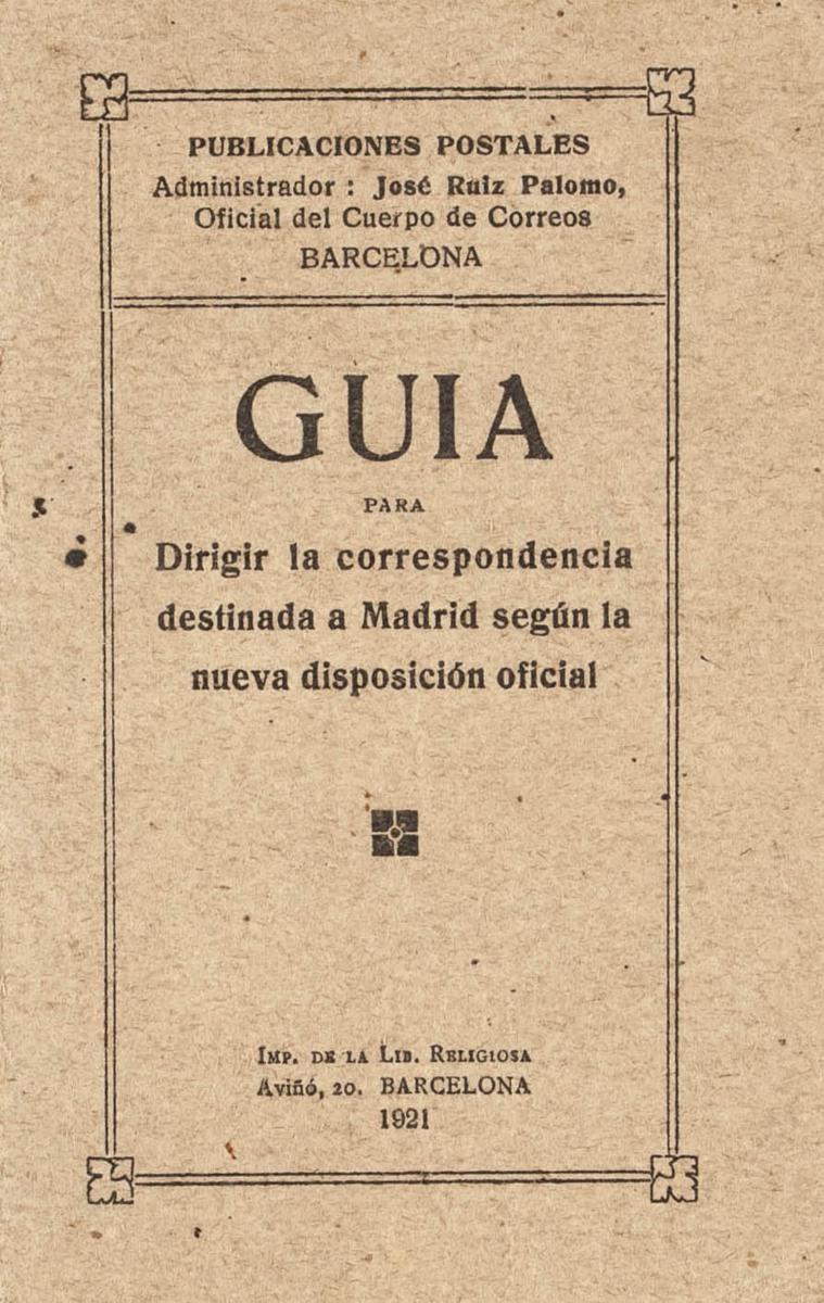 1921. GUIDE TO ADDRESS CORRESPONDENCE DESTINED TO MADRID ACCORDING TO THE NEW OFFICIAL PROVISION. Edition of the Corps of Posts. Barcelona, 1921.