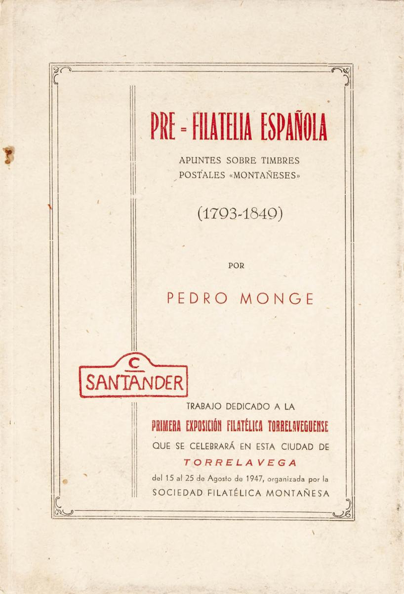 1947. SPANISH PREPHILATELY, NOTES ON "MOUNTAIN" POSTAGE STAMPS (1793-1849), Honorary copy. Pedro Monge. Mountain Philatelic Society. Santander, 1947.