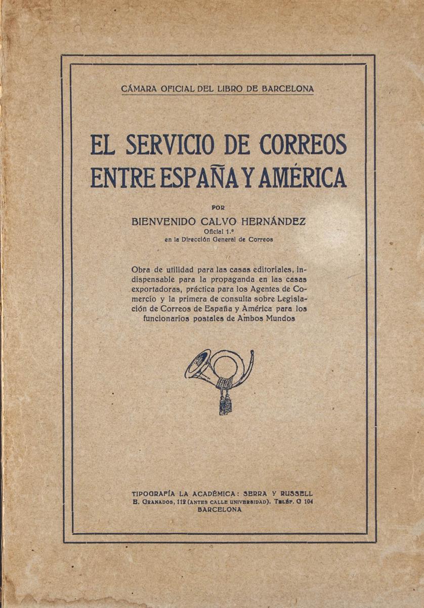 (1950ca). THE POST OFFICE BETWEEN AMERICA AND SPAIN. Welcome Calvo Hernandez. Official Chamber of the Book of Barcelona. Barcelona, 1950. (detached cover)