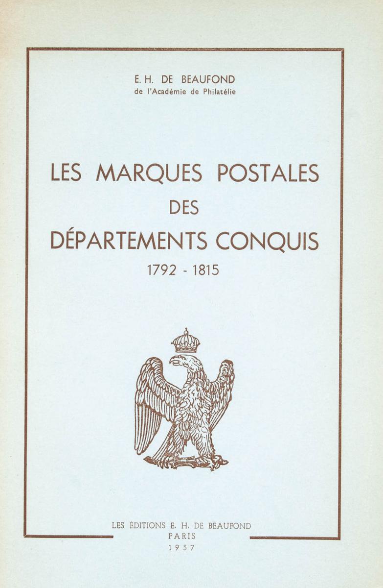 English 1957. LES MARQUES POSTALES DES DEPARTEMENTS CONQUIS 1792-1815, includes translation into English and Spanish. EH Beaufond. Paris, 1957.