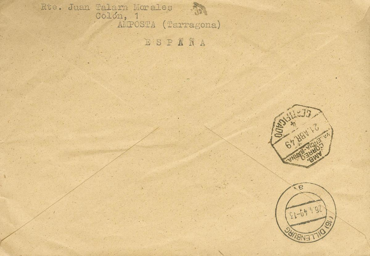 English 1033/34, 883, 1020/21, 1035. 1949. Complete series and various values. Certificate from AMPOSTA (TARRAGONA) to DILLENBURG (GERMANY). On the back arrival. MAGNIFICENT.