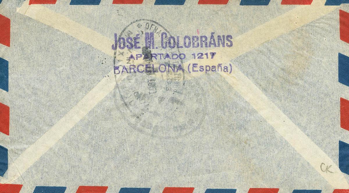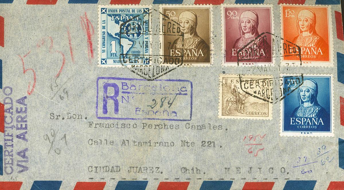 English 1092/95, 1091. 1951. 50 cts, 75 cts, 90 cts, 1.50 pts, 1 blue pts and 5 chestnut cts. Certificate from BARCELONA to CIUDAD JUAREZ (MEXICO). On the back arrival. MAGNIFICENT AND UNUSUAL DESTINATION. (this letter appears photographed in the specialized catalogue)