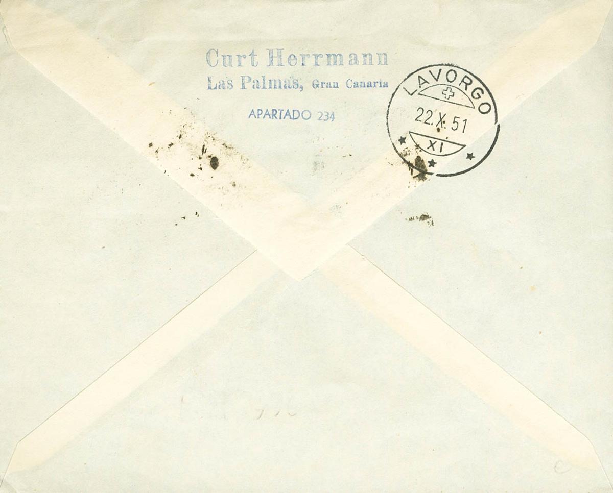 1102, 1021, 1026, 1092. 1951. 50 blue cts, 50 chestnut cts, 15 green cts and 35 green cts. Certificate from LAS PALMAS DE GRAN CANARIA to LAVORGO (SWITZERLAND). On the back arrival. MAGNIFICENT.