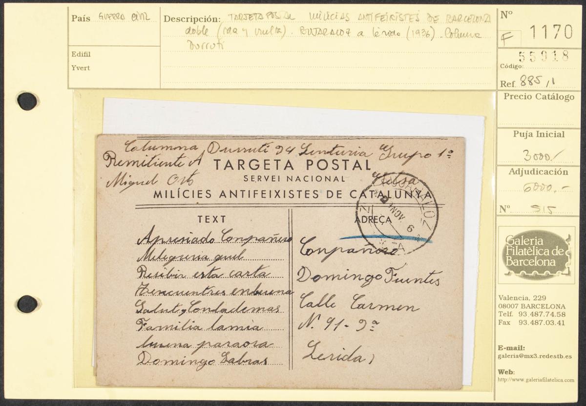 (1936ca). Interesting set of thirteen postcards from the National Server of Anti-Feixist Militias of Catalonia addressed to Barcelona, Azaila (Teruel), Lérida and Sariñena, one sent from the Durruti Column and circulated between 1936 and 1937. MAGNIFICENT.
