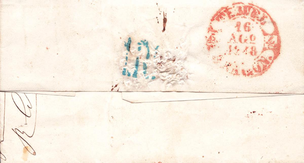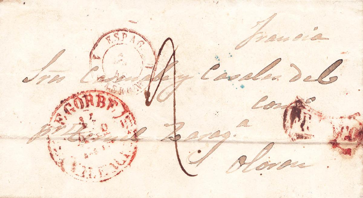 1848. SEGORBE (CASTELLON) to OLORON (FRANCE). Baeza SEGORBE / VALENCIA and brand FRANCO (for general use), in red (PE8) 2004 edition. MAGNIFICENT AND RARE.