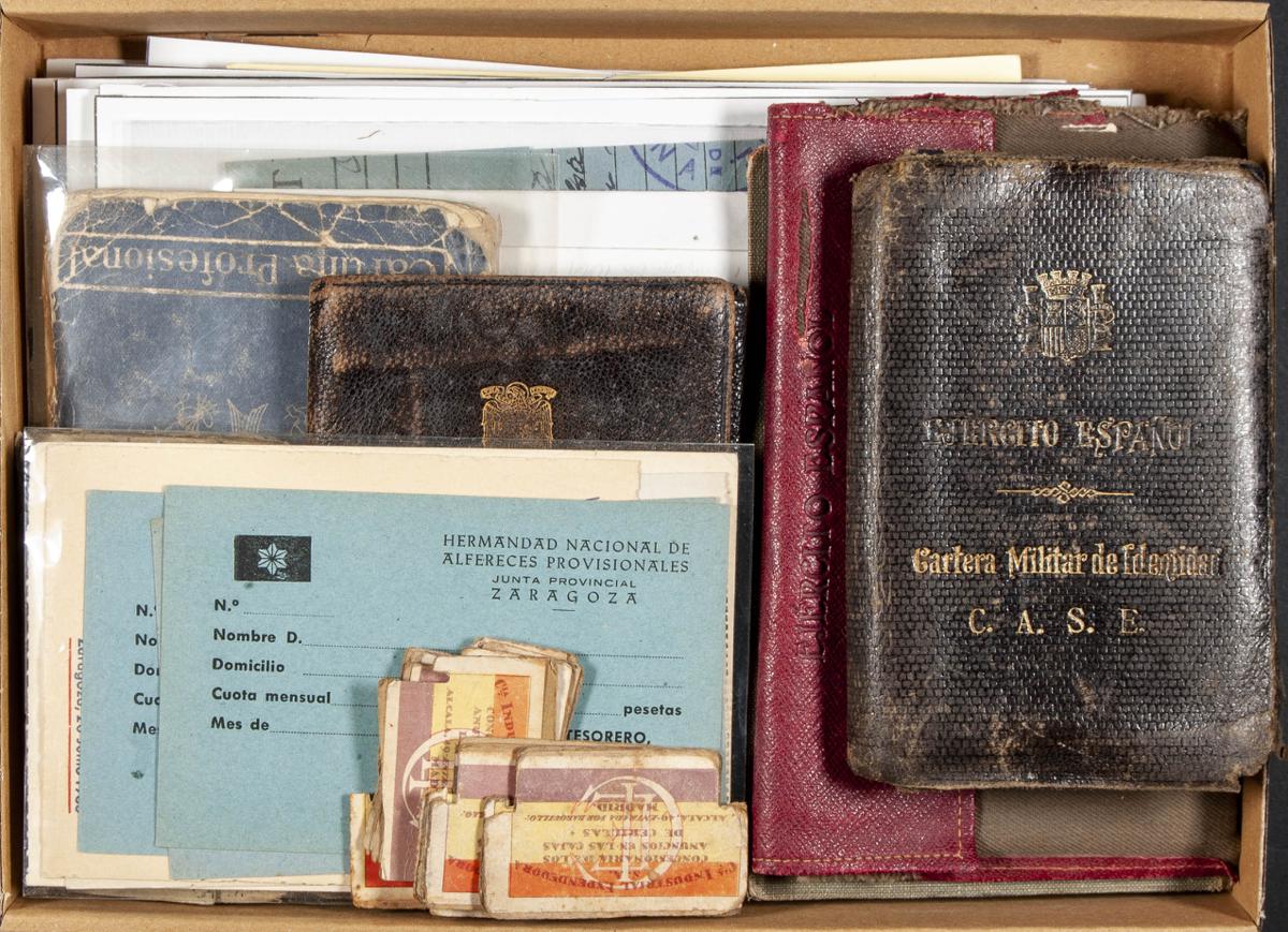 △(1940ca). Interesting set of dozens of cards, primers and other documents from the Ministry of Labor, CNS and Ministry of Agriculture between 1939 and 1950, some with quotation or affiliation labels, including a letter with a franchise mark, Spanish Army portfolios (one with documents indoors), Troop Military Card, a passport and various files. TO EXAMINE.