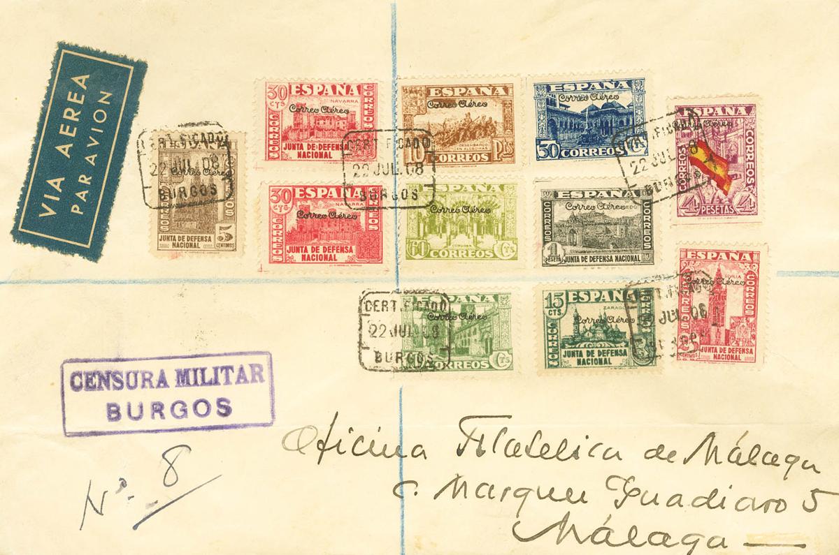 70/80. 1938. Complete series. Certificate from BURGOS to MALAGA. On the back arrival. MAGNIFICENT AND VERY RARE COMPLETE ON LETTER.