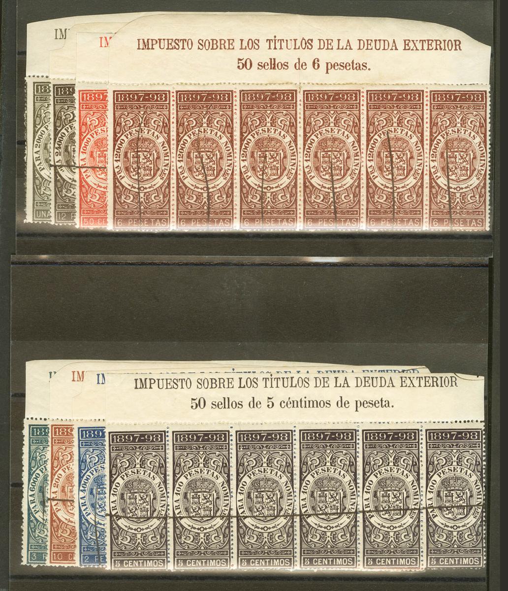 ★★/★1897. Complete series FOREIGN DEBT, eight values, strip of six with sheet header. Unused in pen, from the SAMPLE sheet. MAGNIFICENT AND RARE. (Germany 9/16)