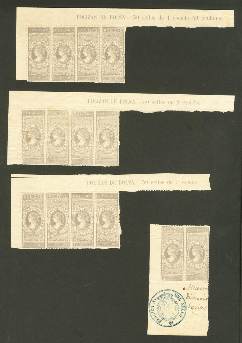 (★)1868. Complete series STOCK POLICIES, three values, strip of four, corner of sheet with legend. From the SAMPLE sheet (it includes a pair of 2 shields with part of the handwritten legend MUESTRA and the FABRICA NL. DEL SELLO mark, in blue. MAGNIFICENT.