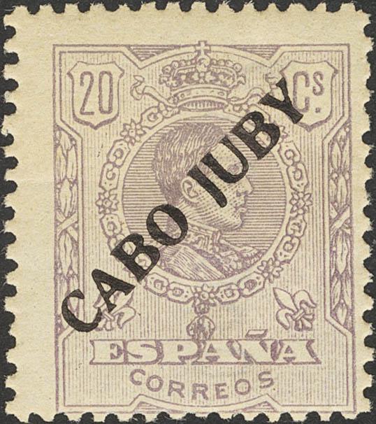 ★★ NE1hp. 1922. 20 cts lilac NOT ISSUED. Variety "J" BROKEN. MAGNIFICENT AND RARE. Cert. EMF. Edifil 2018: +++900 Euros