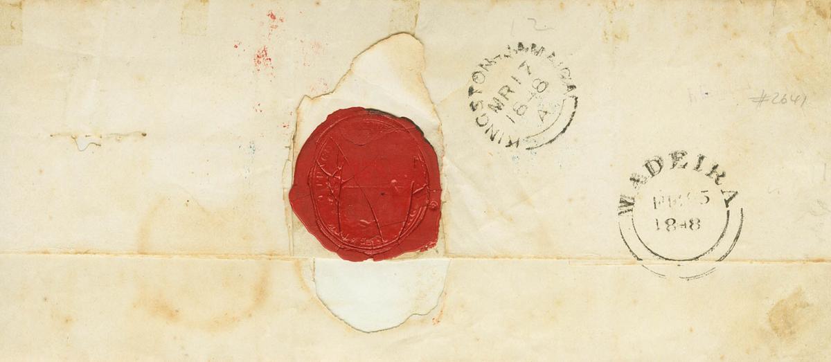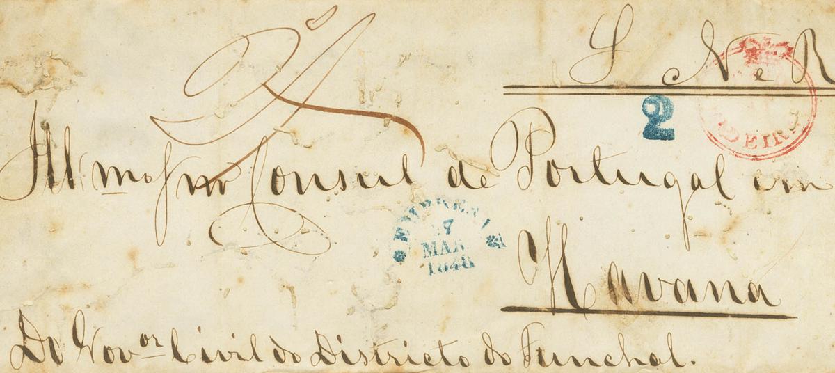 1848. FUNCHAL (MADEIRA) to HAVANA. PAID AT MADEIRA mark, in red from the British Postal Agency and semicircular COMPANY date stamp, in blue and applied at destination to correspondence transported through the Havana Maritime Post Office (PE53) 2004 edition, MADEIRA and KINGSTON date stamps on the back -JAMAICA, in black both from the British Postal Agency. MAGNIFICENT AND ONLY KNOWN WITH THE MARK OF MADEIRA DIRECTED TO HAVANA.