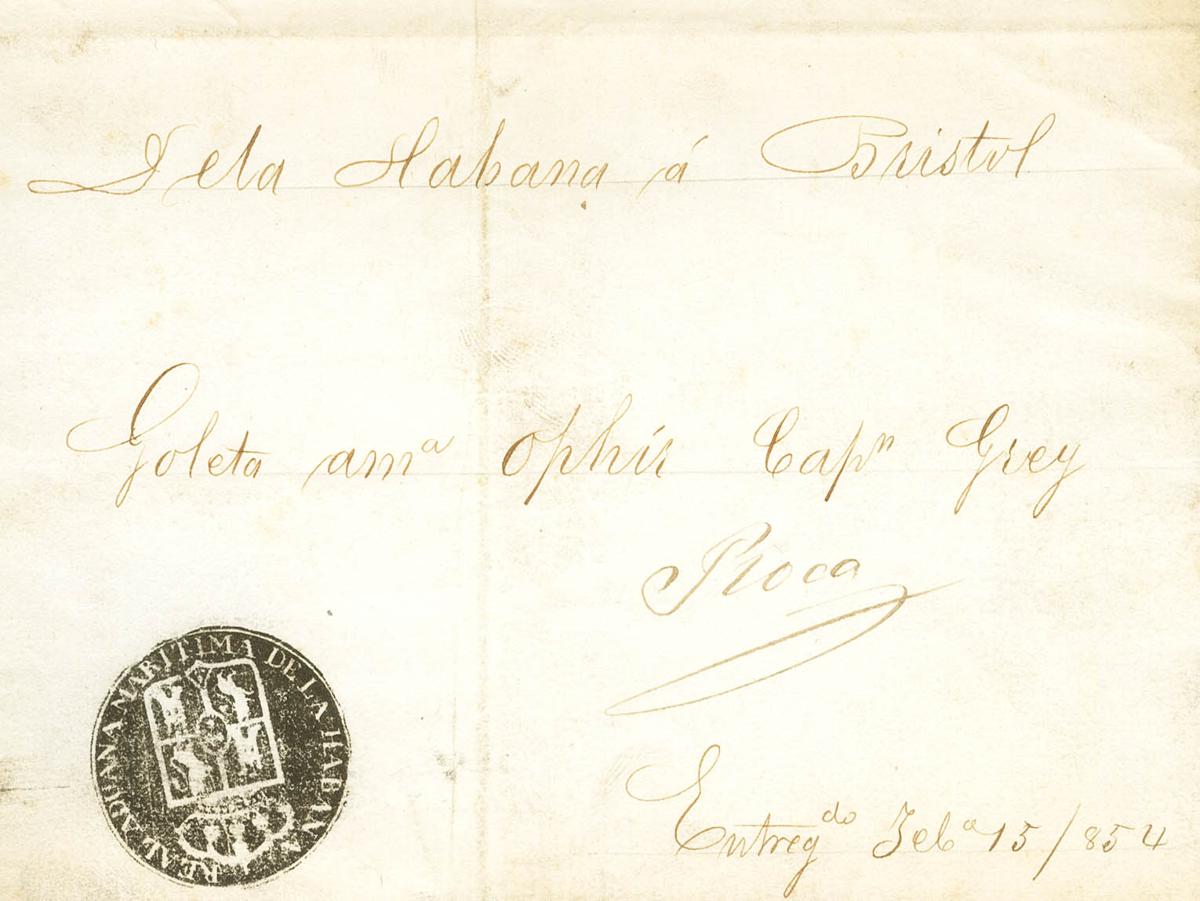 1854. Shipment Record of the Armed Schooner "Ophir" from HAVANA to BRISTOL (ENGLAND). ROYAL ADUANA MARITIMA DE LA HABANA brand, in negative. MAGNIFICENT AND VERY RARE.