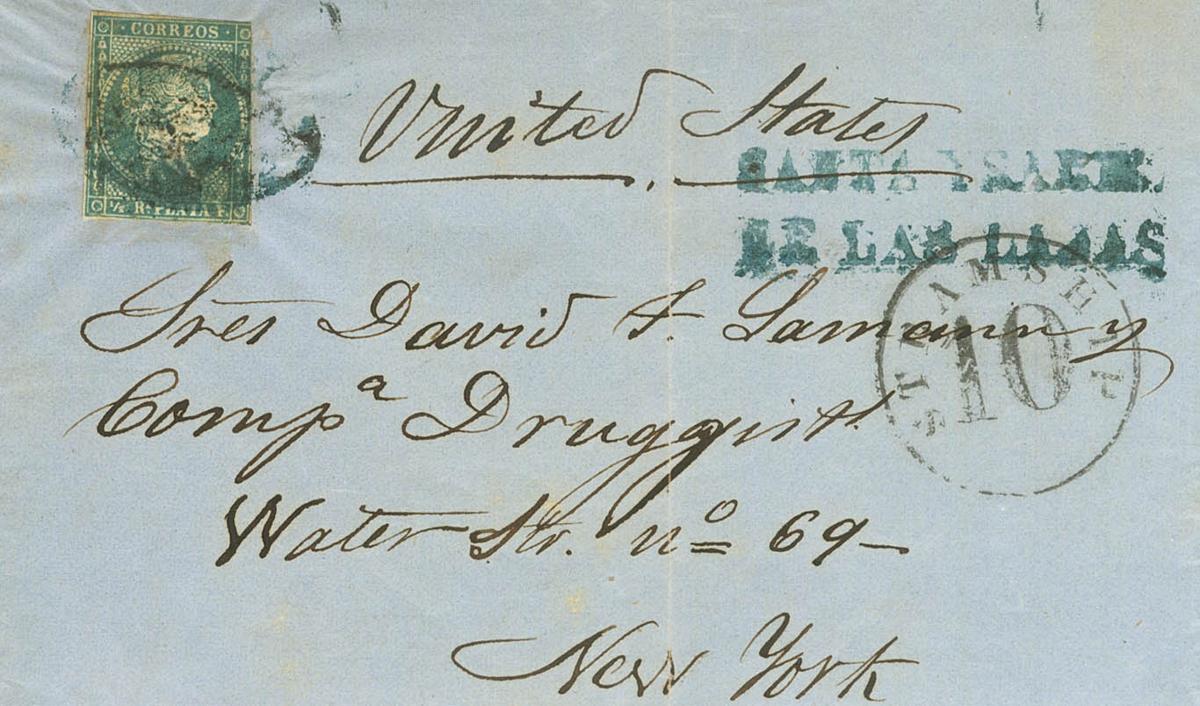 Ant.4. 1857. ½ real teal. CARTAGENA (CUBA) to NEW YORK (USA). On the front pre-philatelic mark SANTA YSABEL / DE LAS LAJAS, in blue and circular STEAMSHIP / 10, in black. MAGNIFICENT AND RARE.
