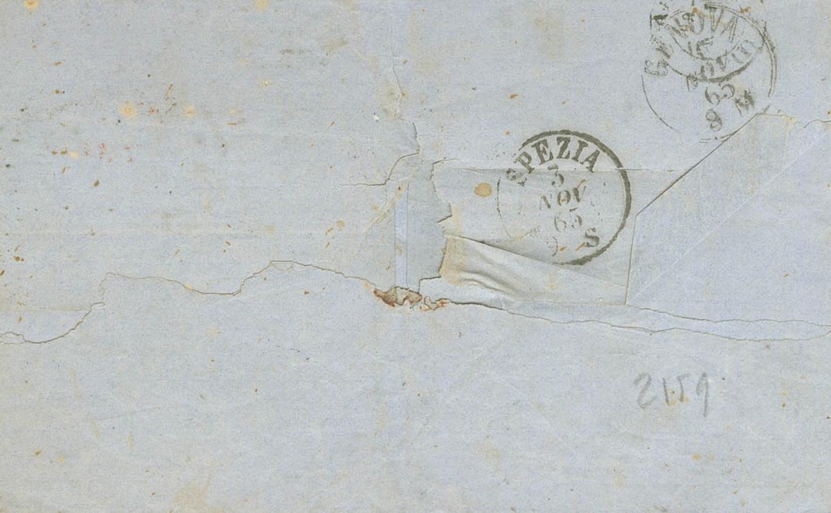 1865. Stamps of Italy from 1863, 30 chestnut cts, two stamps and from 1865, 20 cts over 15 blue cts, three stamps. CARRARA (ITALY) to HAVANA, circulated via Liverpool and New York. Postmark CARRARA / * and date stamp N.YORK.BR.PKT on the front, in red and mark NE2, in black and applied at destination to indicate provenance. MAGNIFICENT AND RARE DESTINATION.