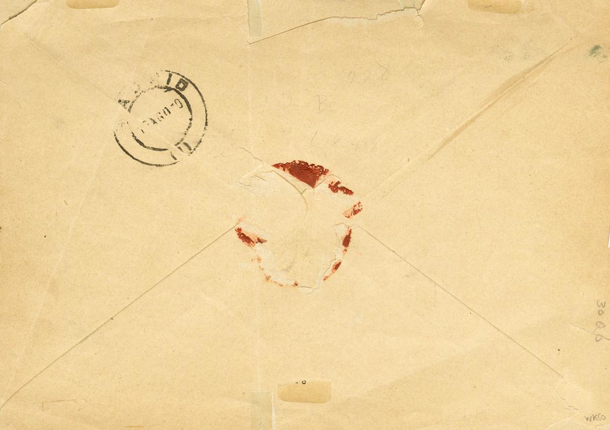 27, 28, 40(4), 40B. 1898. 50 cts over 10 cents yellow chestnut, 50 cts over 10 cents carmine, 5 cents over 1/8 of a green cent, four stamps and 5 cents over 5 green-blue cents. FERNANDO POO to MADRID. Postmark CORREOS / FERNANDO POO, in violet and arrival on the back. MAGNIFICENT AND SPECTACULAR POSTAGE OF DIFFERENT ISSUES.