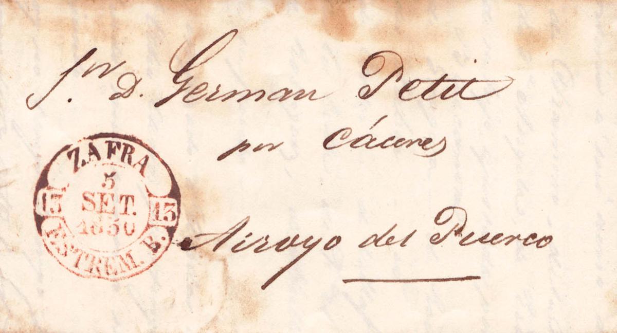 1850. USAGRE (BADAJOZ) to ARROYO DEL PUERCO (CACERES). Baeza ZAFRA / ESTREM.B., in red. MAGNIFICENT.