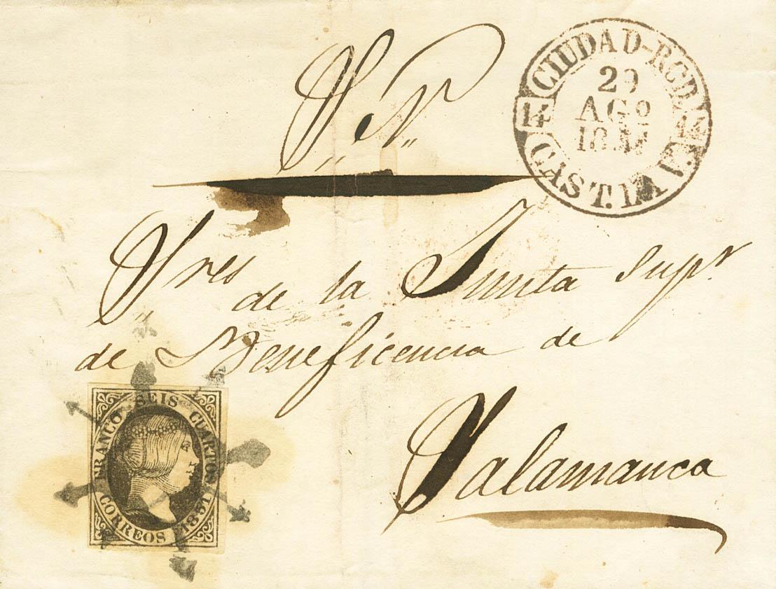 6. 1851. 6 cuartos black. RODRIGO CITY to SALAMANCA. ARAÑA postmark, stamped twice, at origin and destination and on the front baeza CIUDAD-ROD. / CAST.LA V., in red. MAGNIFICENT AND RARE.
