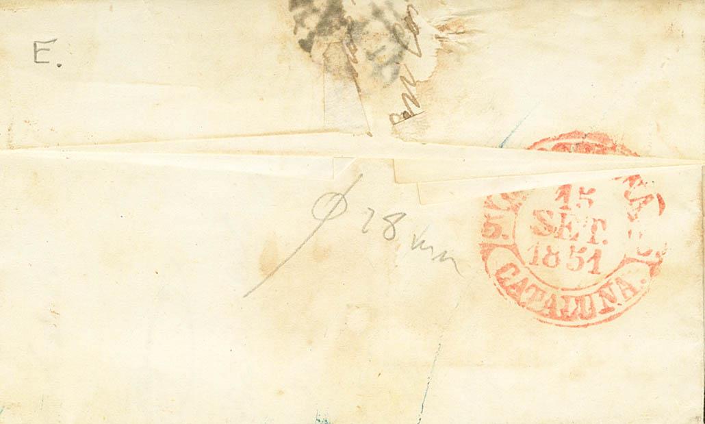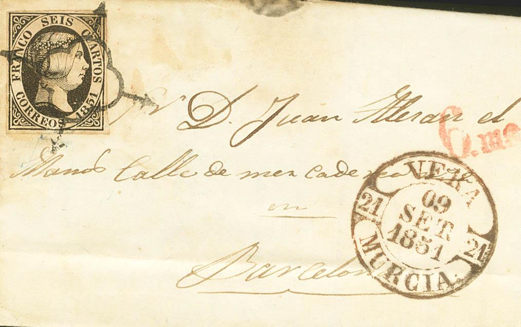 6. 1851. 6 cuartos black. GARRUCHA (ALMERIA) to BARCELONA. In the front baeza VERA / MURCIA. MAGNIFICENT.