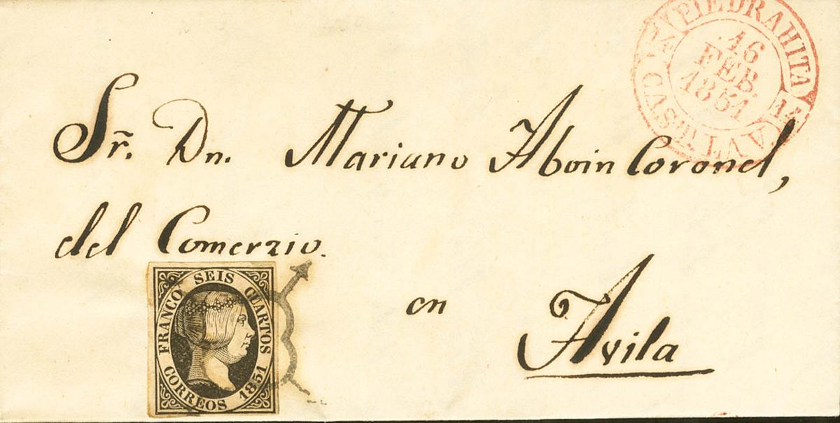 6. 1851. 6 cuartos black. STONE to AVILA. On the front baeza PIEDRAHITA / CAST.LA V. MAGNIFICENT PRINTING.