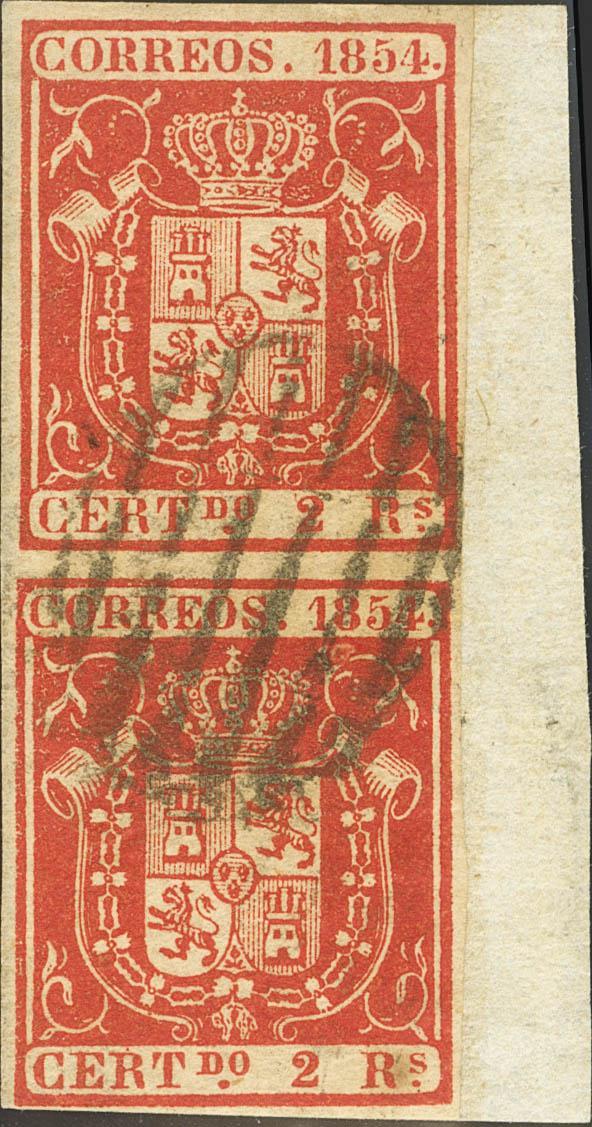 △ 25(2). 1854. 2 red reales , in pairs, on a fragment. MAGNIFICENT. Edifil 2020: 260 Euros