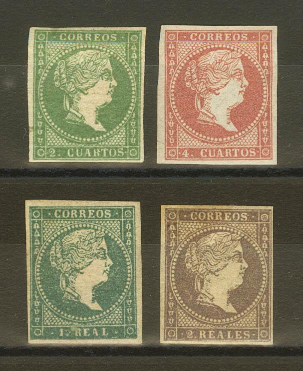 ★/(★) 43/46. 1855. Complete series (huge margins and intense colors). MAGNIFICENT. Cert. GRAUS (2 reales). (neither the 2 cuartos nor the 1 real have a certificate, they are sold as is and without guarantee, the lamp shows some small stain, the series presents a spectacular presence)