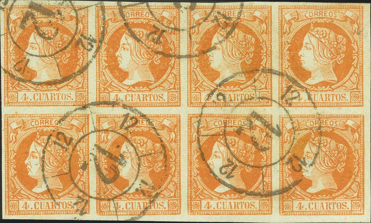 52(8). 1860. 4 orange cuartos , block of eight. Postmark R.CARRETA Nº12, from Oviedo. MAGNIFICENT.
