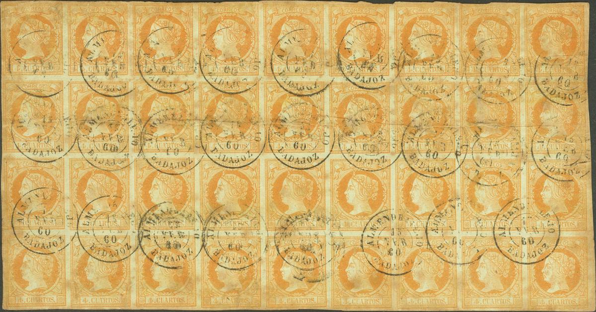 52(36). 1860. 4 cuartos orange, block of thirty-six (some minor flaws). Postmark ALMENDRALEJO / 15-FEB-60 / BADAJOZ, circulated in the transition period between the two issues. MAGNIFICENT AND SPECTACULAR BLOCK.
