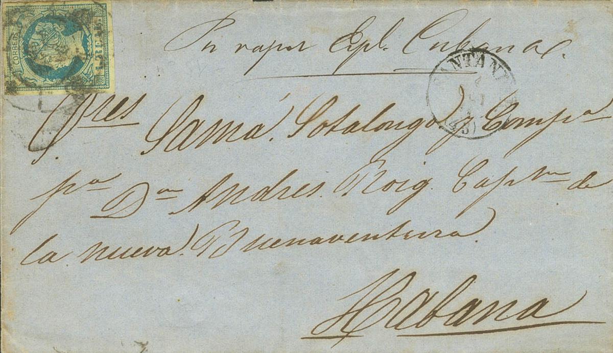 55. 1861. 1 real blue. SANTANDER to HAVANA (CUBA). Postmark R.CARRETA Nº43 and on the front handwritten "By Vapor Expedición Cubana". MAGNIFICENT.