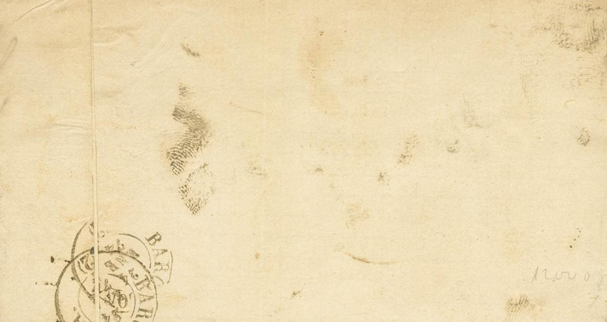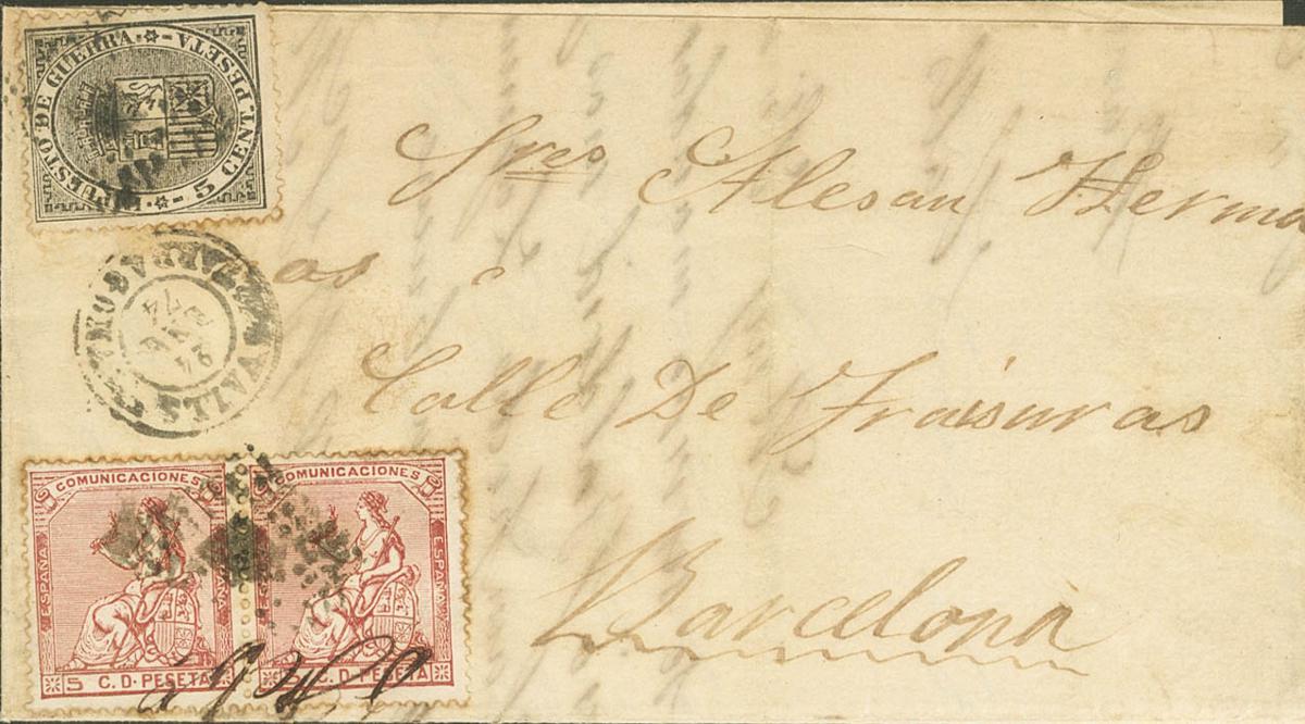 132(2), 141. 1874. 5 pink cts, two stamps and 5 black cts for War Tax. VALLS to BARCELONA. MAGNIFICENT AND RARE POSTAGE COMBINATION.