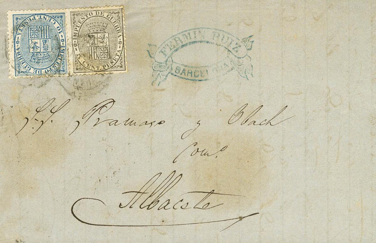 141, 142. 1874. Complete series. BARCELONA to ALBACETE. MAGNIFICENT AND RARE COMBINATION OF POSTAGE WITH WAR TAX STAMPS.