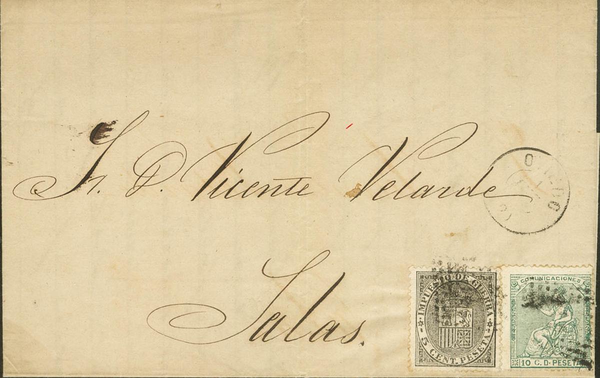 141, 133. 1874. 10 green cts and 5 black cts from War Tax. OVIEDO to ROOMS. On the OVIEDO front / 1-ENE-74 / (12). MAGNIFICENT AND RARE, FIRST DAY OF CIRCULATION OF THE WAR TAX STAMP AND ITS CORRESPONDING APPLICATION.
