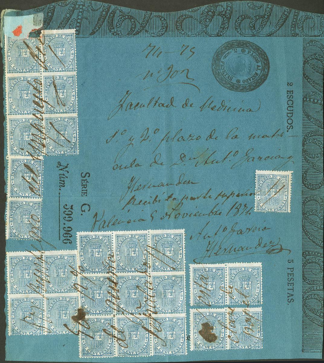 142(26). 1874. 10 blue cts, twenty-six stamps. Document of Payments to the State of VALENCIA. Unused by pen (fiscal use). MAGNIFICENT.