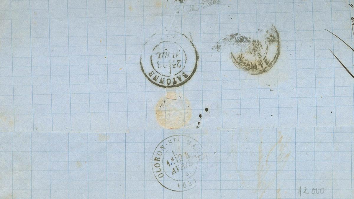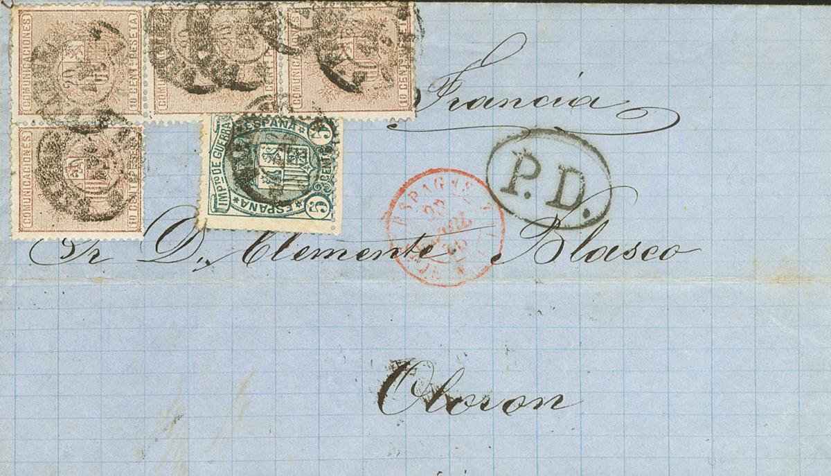 English 153(4), 154. 1875. 10 chestnut cts, four stamps and 5 green cts of War Tax that is not valid for correspondence abroad, but the postage is correct and it is not taxed. PALENCIA to OLORON (FRANCE). MAGNIFICENT AND SPECTACULAR POSTAGE.