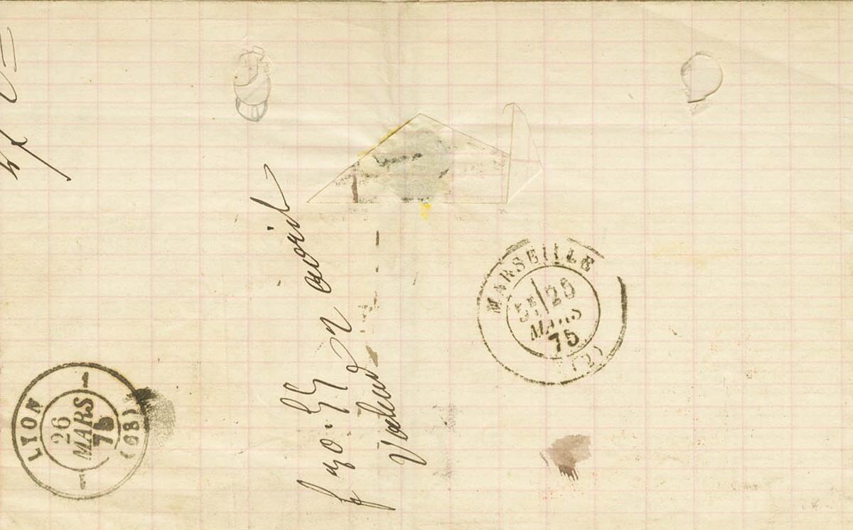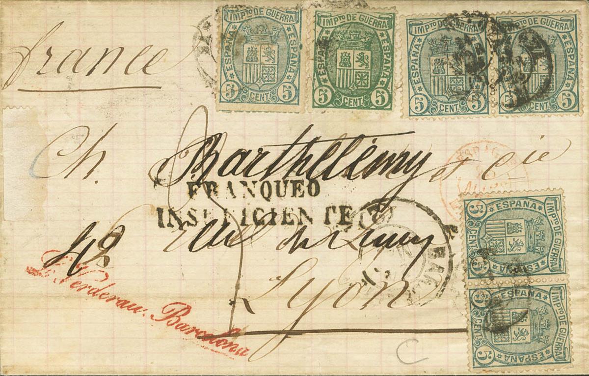 154(8). 1875. 5 cts green, six stamps (different shades). BARCELONA to LYON (FRANCE). On the front it marks POSTAGE / INSUFFICIENT, in black and French entry date. MAGNIFICENT AND VERY RARE COMBINATION OF POSTAGE TO INSUFFICIENTLY COMPLETE THE RATE OF 40 CTS TO FRANCE, ESPECIALLY COMPOSED OF WAR TAX STAMPS.