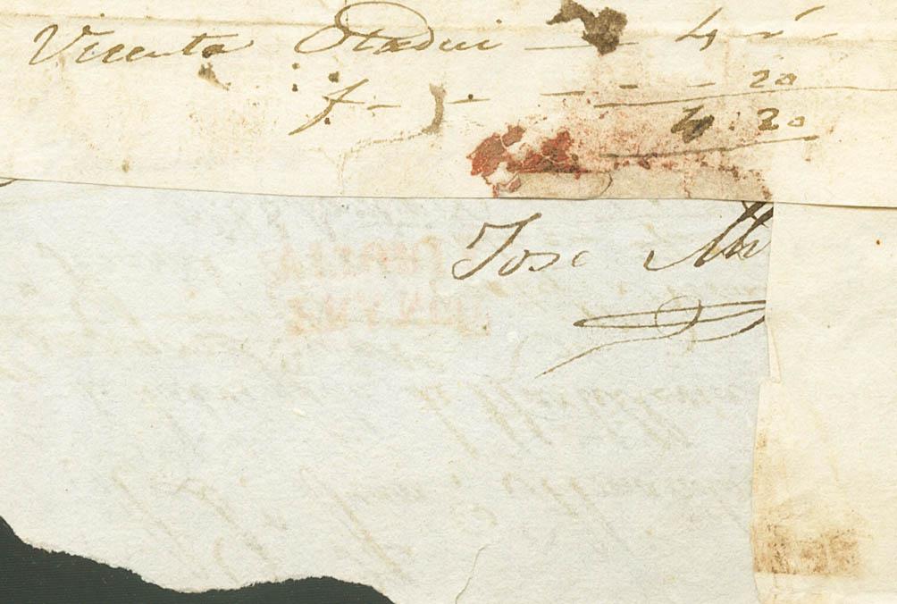 1834. Front of Certificate from VITORIA to SAN SEBASTIAN (addressed to a soldier of the Artillery Brigade of General Lacy Evans, belonging to the British Auxiliary Legion). Handwritten mark "Certifº to Vitoria, issued on August 27, 1836" and FRANCO / VITORIA mark, in red (PE26) 2004 edition, various reason shots in Haro, Logroño, Tudela and Zaragoza, the deviation from the usual post routes is forced to avoid the assault of the Carlists to the post office, Certificate Nº 466, annotation of the cost by Vicente Otadui "As he paid 4 reales for certificate rights and 20 maravedíes", recipient's signature on the back. MAGNIFICENT AND EXTREMELY RARE, THE ONLY KNOWN CERTIFICATE OF THE BRITISH LEGION IN SPAIN, PIECE OF HUGE INTEREST.