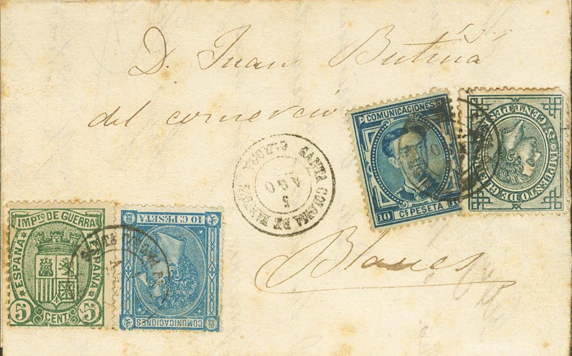 164, 154, 175, 183. 1876. 10 blue cts from 1875, 5 cts from 1875 War Tax, 10 blue 1876 cts and 5 green cts from 1876 War Tax. SANTA COLOMA DE FARNERS (GERONA) to BLANES . The letter is franked with stamps from the 1875 issues already demonetized, so it is retained and the following day the correct stamps in force from the 1876 issues are applied. MAGNIFICENT AND VERY RARE POSTAGE OF TWO DIFFERENT ISSUES, ONE OF THEM OUTSIDE THE PERIOD OF POSTAL VALIDITY.