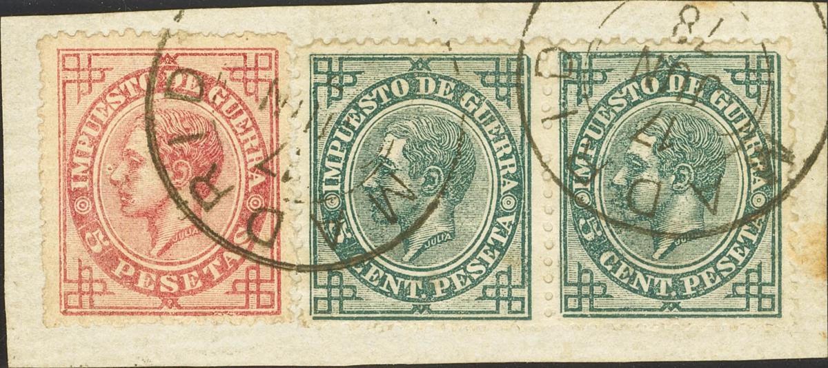 English △ 187, 183(2). 1876. 5 pink pts and 5 green cts, pair, on fragment. MADRID postmark / (1). MAGNIFICENT AND PIECE OF HUGE SPECTACULARITY.