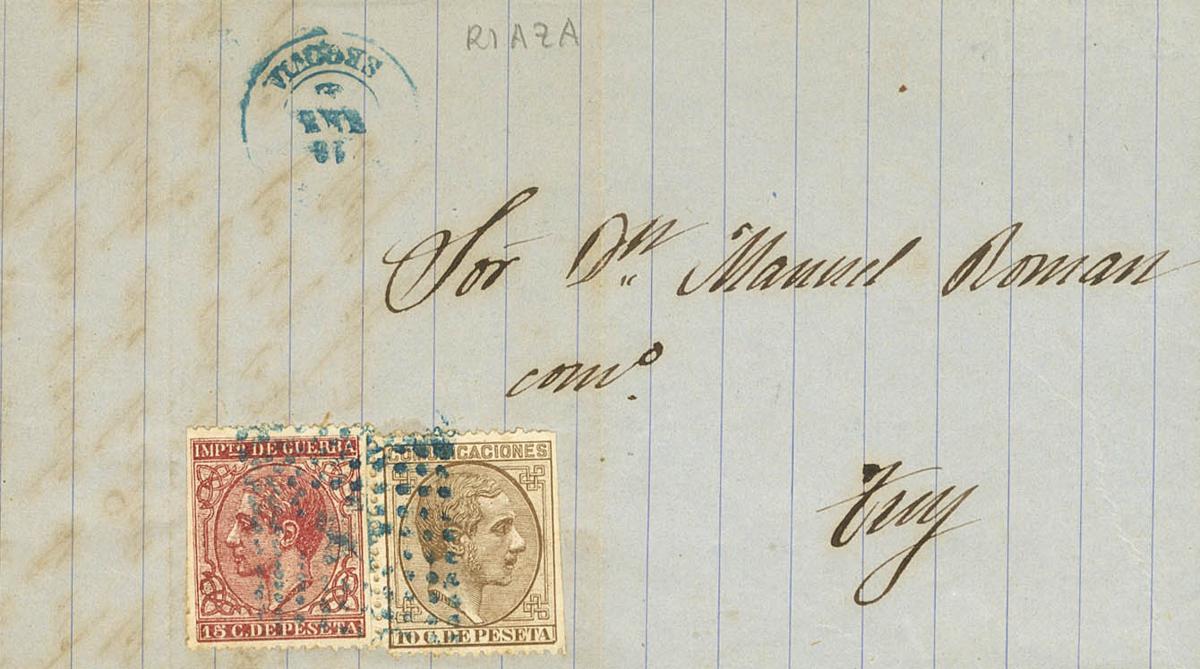 English 192, 188. 1879. 10 chestnut cts and 15 carmine cts. RIAZA (SEGOVIA) to TUY. Postmark RHOMBUS WITH POINTS WITH STAR, in blue. MAGNIFICENT AND RARE.
