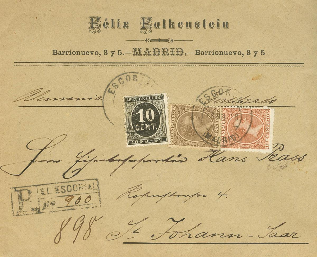 217, 223, 237. 1898. 10 yellow chestnut cts, 40 chestnut cts and 10 black cts from War Tax. Certificate from EL ESCORIAL to SAINT JOHANN (SARRE). ESCORIAL / (MADRID) postmark and arrival on the back, the letter was correctly franked with 50 cts (25 cts + 25 cts of certificate right) according to the April 1888 rate, for which reason the administration ignored the War Tax stamp ( not valid for foreigners) and completed it. MAGNIFICENT AND RARE, ESPECIALLY DIRECTED TO SARRE.
