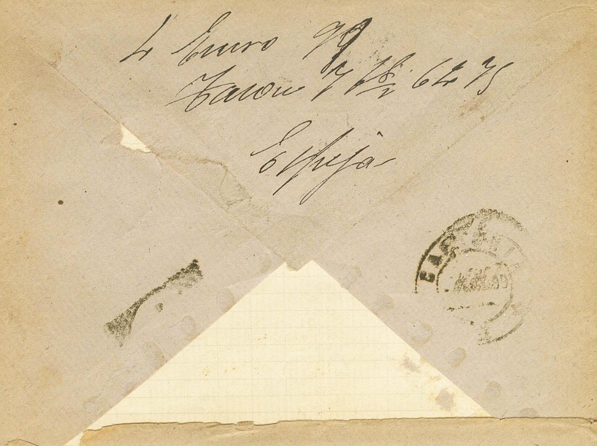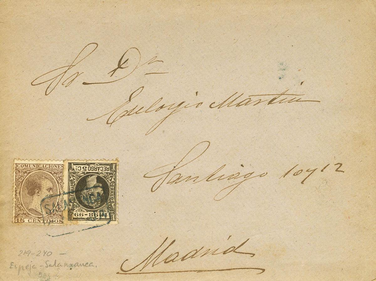 219, 240. 1899. 15 violet chestnut cts and 5 black cts from War Tax. MIRROR (SALAMANCA) to MADRID. Postmark SALAMANCA / ESPEJA postmark, in blue. MAGNIFICENT.