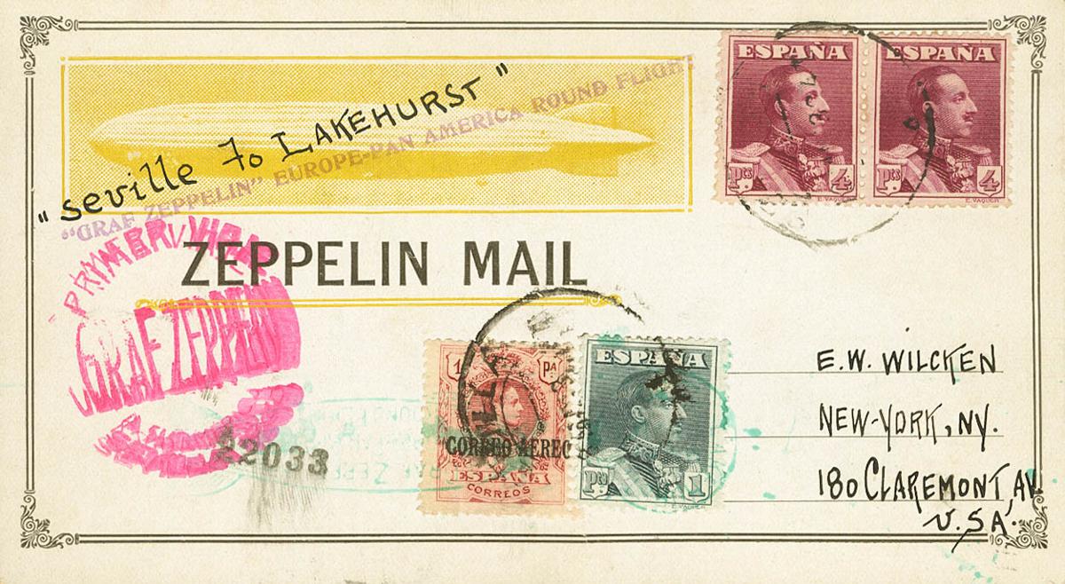 321, 322(2), 296. 1930. 1 slate pts, 4 violet carmine pts, two seals and 1 carmine pts. Illustrated Postcard of the Graf Zeppelin from SEVILLE to NEW YORK (USA). On the front unusual linear marking "GRAF ZEPPELIN" EUROPE-PAN AMERICA ROUND FLIGHT, in purple and arrival in green at Lakehurst. MAGNIFICENT AND RARE.