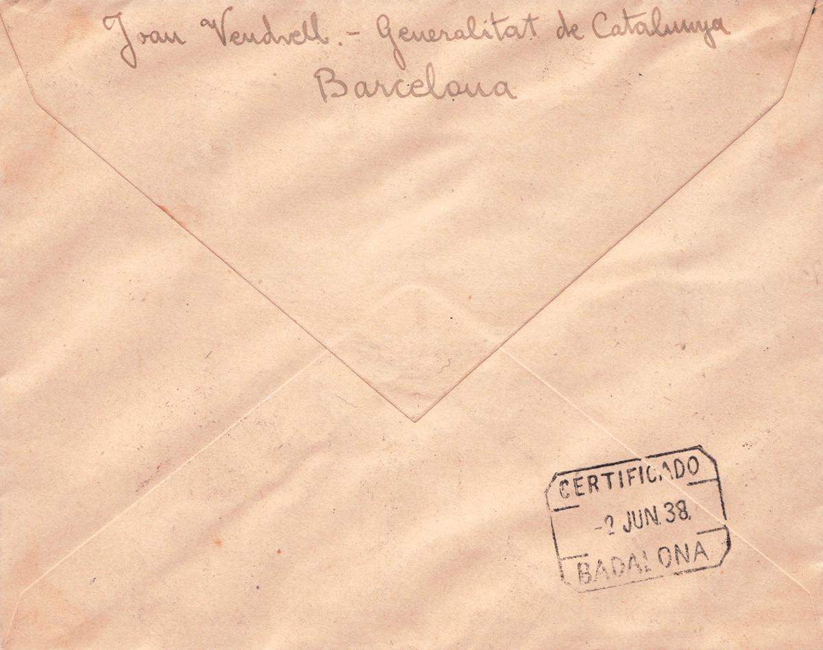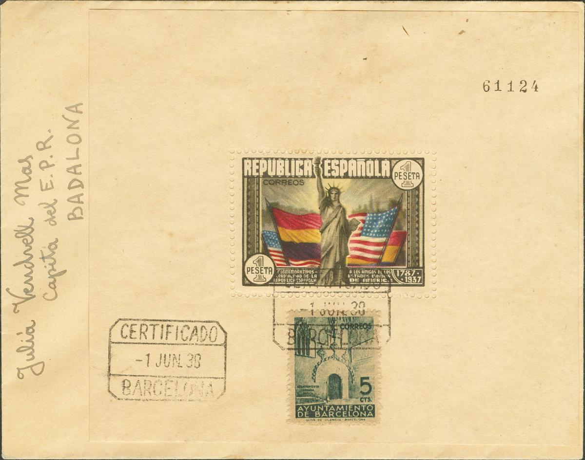 764. 1938. Block sheet. Philatelic Certificate from BARCELONA to BADALONA. MAGNIFICENT. Edifil 2023: 50 Euros