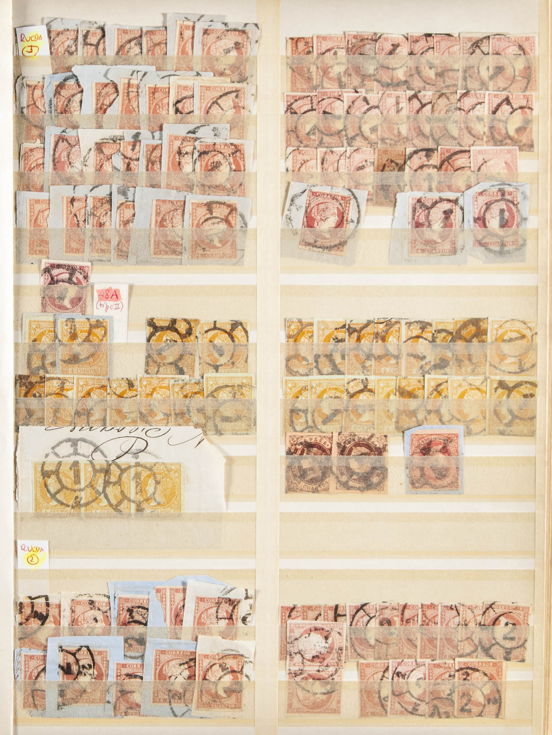 (1855ca). Interesting set of approximately one thousand stamps of the 4 cuartos of the issues of 1855, 1860, 1862 and 1864, with Rueda de Carreta postmark. TO EXAMINE.