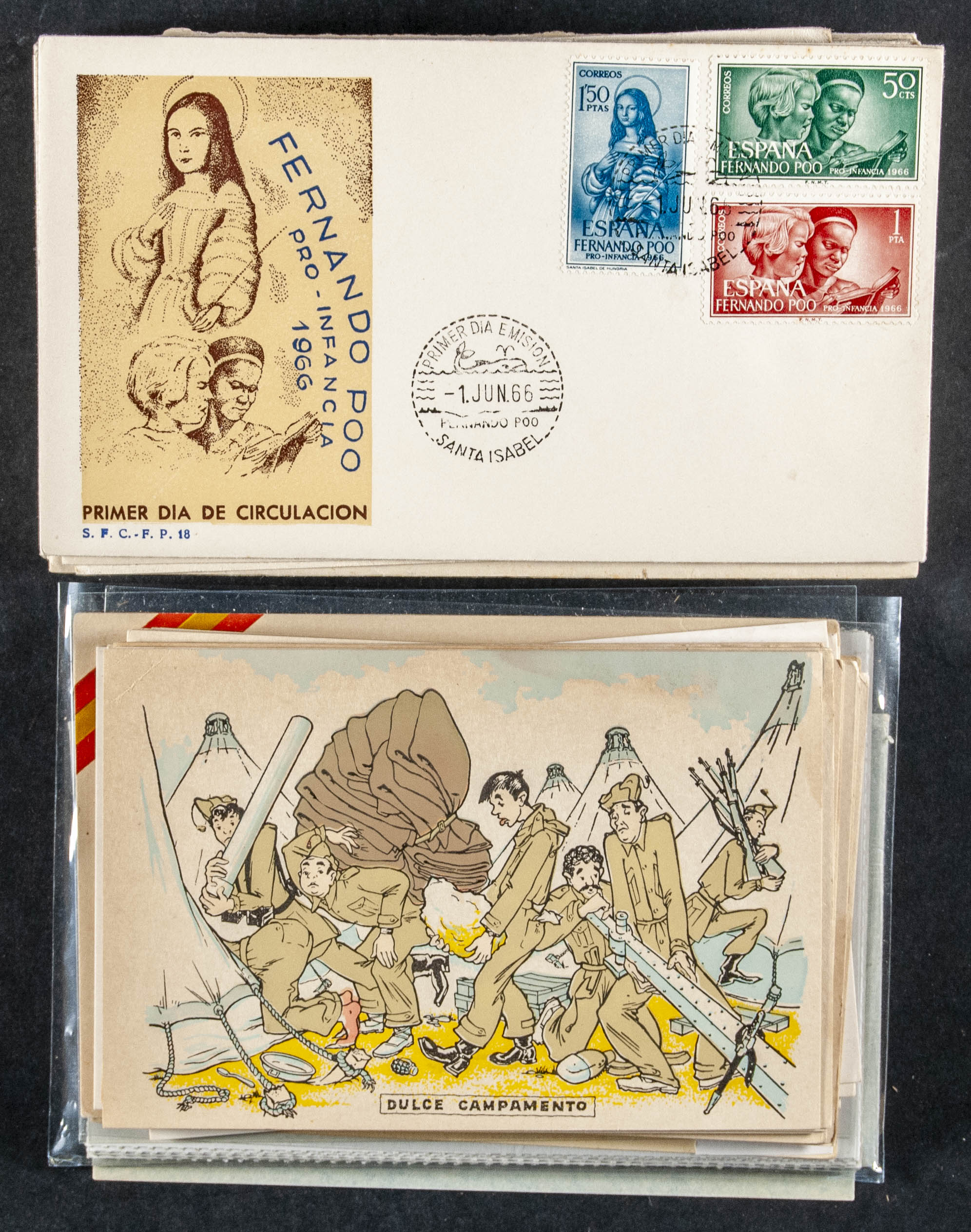 (★)(1940ca). Set of unused postcards, most from the forties and fifties, some repeated, includes three postcards (two Military and one from Fronts and Hospitals), as well as several Colonial First Day Covers. TO EXAMINE.