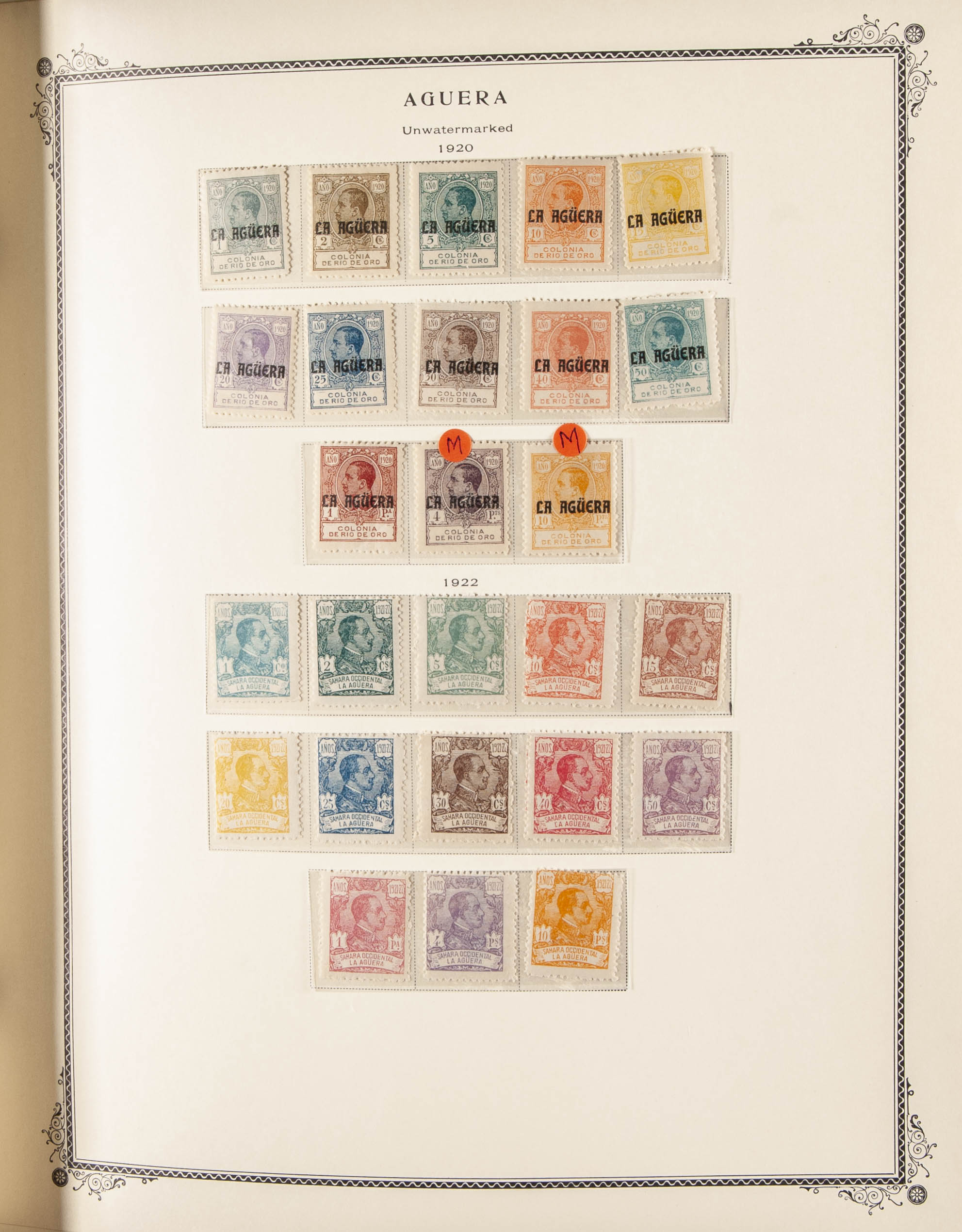 ★/(1854ca). Spectacular collection of Spanish Colonies assembled in a Scott album between 1854 and 1975 including the Overseas Colonies, most of them new and very complete with series and high-value individual stamps such as classics from Cuba and the Philippines, where the rare 5- cuartos vermilion from 1855 stands out. (some defect), includes most of the high-value series from Fernando Poo, Guinea, Río de Oro, Morocco and Tangier as well as numerous varieties, unissued and some policies, many with certificates. VERY HIGH CATALOG VALUE. ESSENTIAL TO EXAMINE.