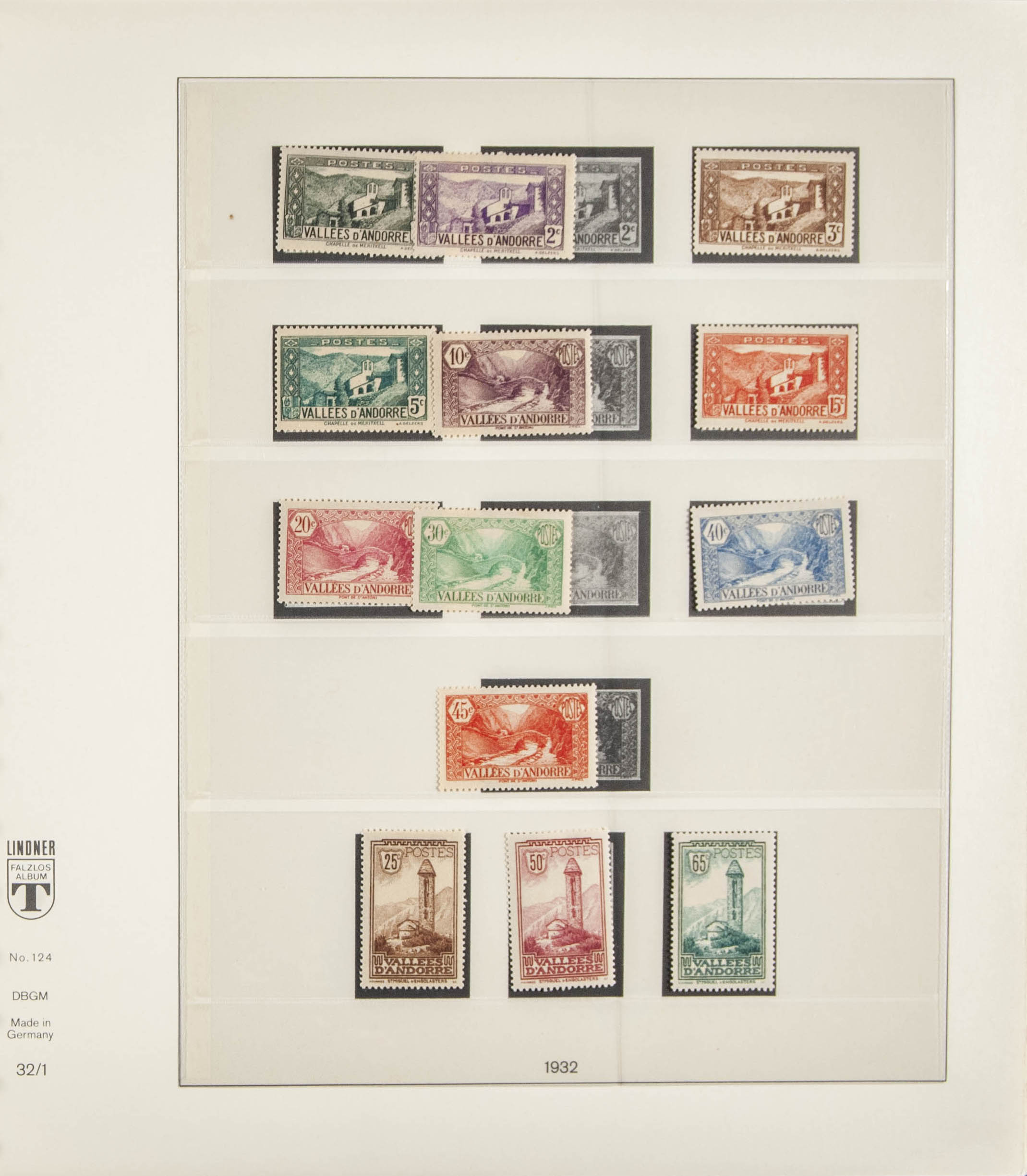 ★★/★(1932ca). Collection of French Andorra between 1932 and 1986, new and with some intermediate faults, highlighting the landscape series of 1932 (twenty-four values) and 1937 (thirty-two values) (mounted in the Lindner album). HIGH CATALOG VALUE. TO EXAMINE. Edifil 2023: +1,500 Euros
