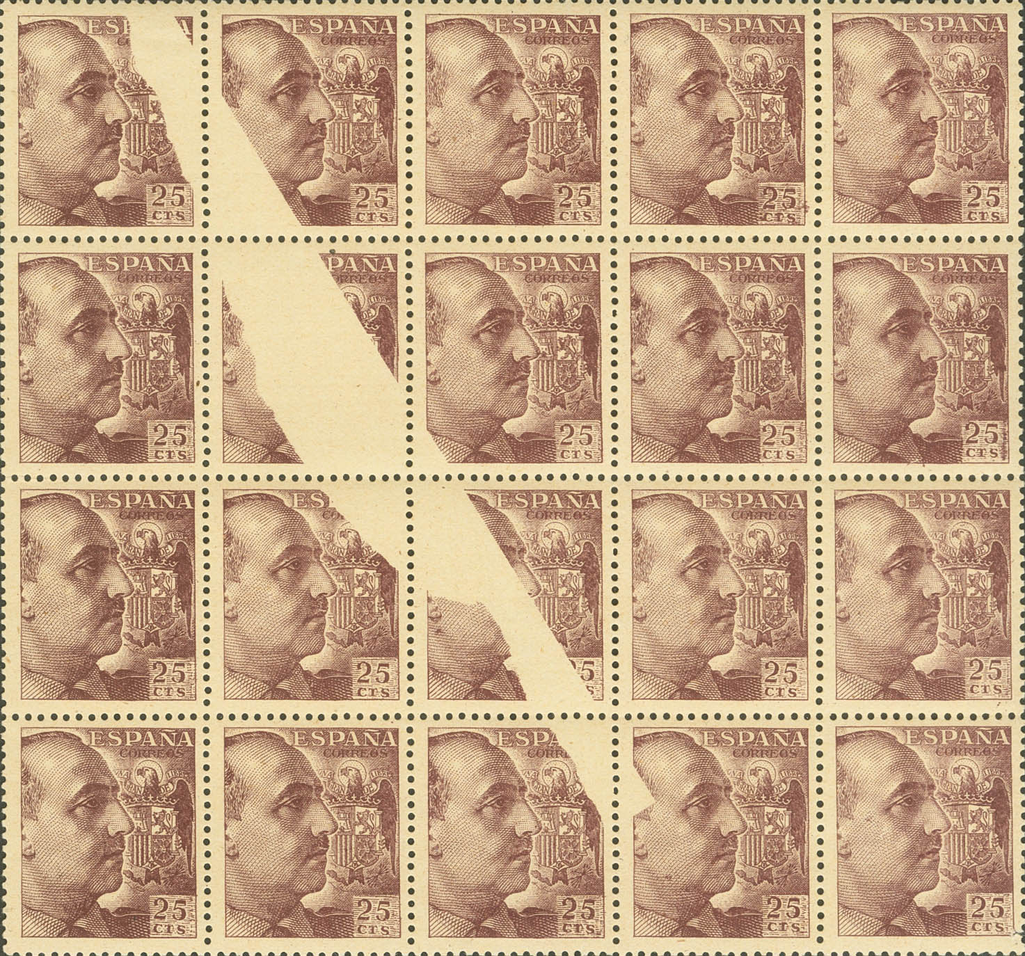 ★★/★ 1048(20). 1949. 25 cts chestnut lilac, block of twenty stamps. VARIETY of printing on eight stamps by INCLUSION OF PAPER. MAGNIFICENT AND RARE.